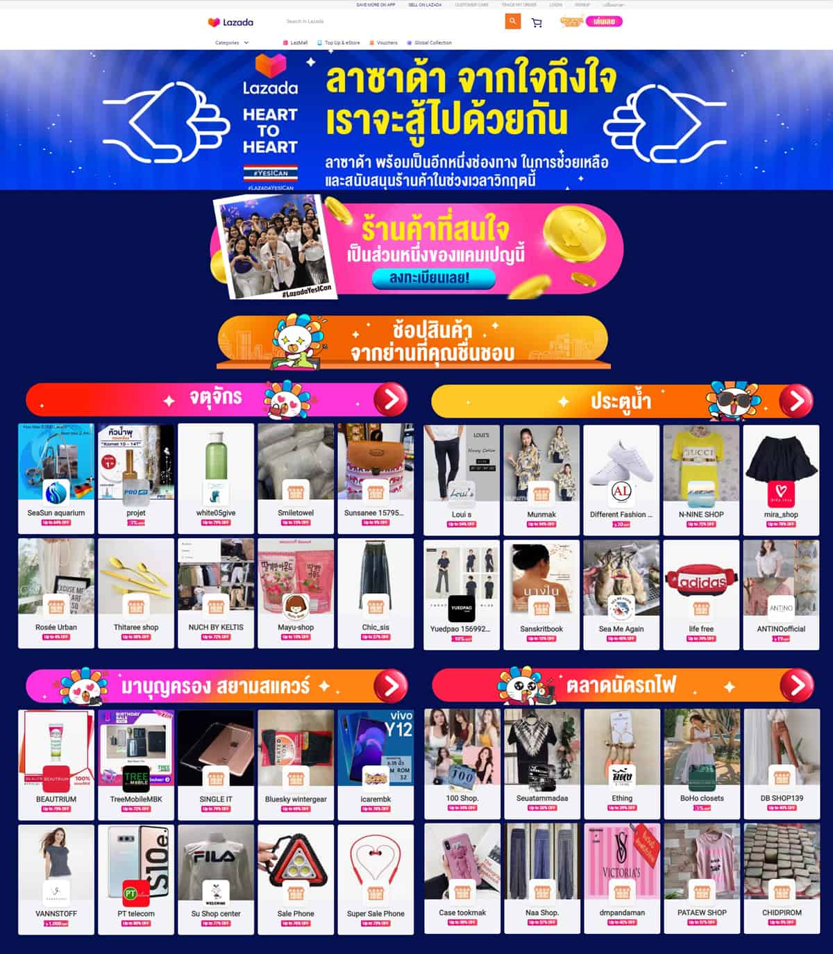 ลาซาด้า ผู้นำด้านอีคอมเมิร์ซในเอเชียตะวันออกเฉียงใต้ เปิดตัวแคมเปญ “#YesICan ลาซาด้า จากใจถึงใจ” จำลองย่านช้อปปิ้งชื่อดัง อาทิ สยาม จตุจักร มาไว้บนแพลตฟอร์มออนไลน์ให้คนไทยได้หายคิดถึงโดยมีแหล่งช้อปปิ้งชั้นนำขวัญใจนักช้อปที่เข้าร่วมโครงการแล้ว อาทิ จตุจักร มาบุญครอง สยามสแควร์ สำเพ็ง เยาวราช คลองถม โบ๊เบ๊ และตลาดนัดรถไฟ ซึ่งต่างได้รับผลกระทบจากโควิด-19 มาร่วมเปิดร้านค้าออนไลน์บนลาซาด้าโดยไม่มีค่าใช้จ่าย พร้อมอัดแคมเปญส่งเสริมการตลาดเพื่อช่วยสนับสนุนร้านค้า