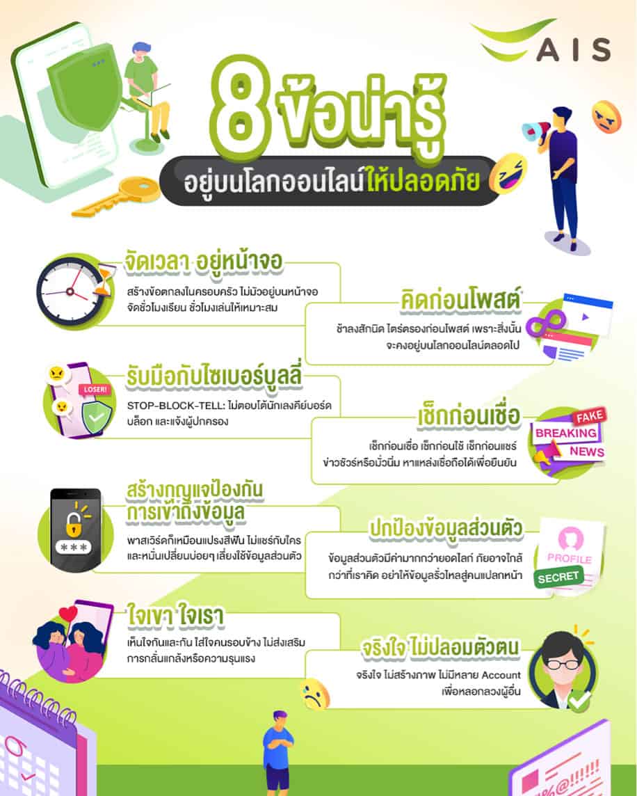 โครงการ AIS อุ่นใจไซเบอร์ เป็นหนึ่งในตัวอย่างโครงการของภาคเอกชน ที่มีเป้าประสงค์ในการสร้างภูมิคุ้มกัน รณรงค์ ปลูกจิตสำนึก ให้คนไทยเกิดการตระหนักรู้ ควบคู่ไปทักษะเพื่อให้ใช้ดิจิทัลอย่างรู้เท่าทันและปลอดภัย สอดรับกับสถานการณ์ที่สังคมไทยกำลังเผชิญ ประกอบกับบรรยากาศในช่วงวันครอบครัว 14 เมษายน เอไอเอส จึงขอใช้โอกาสนี้ชวนเชิญทุกครอบครัวมาร่วมรณรงค์ปลูกจิตสำนึกในการใช้งาน ด้วยชุดการเรียนรู้ 8 ทักษะการเอาตัวรอดและรับมือภัยบนโลกออนไลน์ สนับสนุนมาตรการ “อยู่บ้าน หยุดเชื้อ เพื่อชาติ ฉลาดใช้ดิจิทัล”
