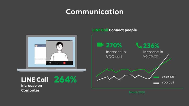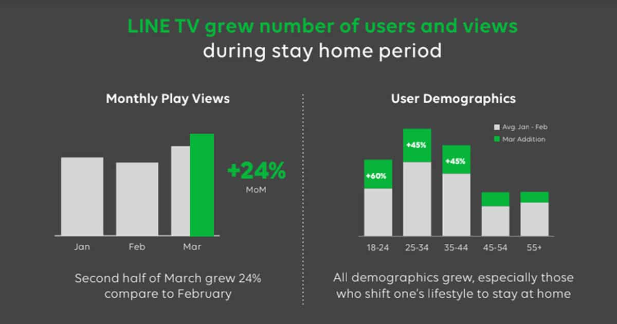 LINE ได้เพิ่มแท็บข่าว ‘โควิด-19’ โดยเฉพาะบน LINE TODAYเพื่อตอบรับการเปลี่ยนแปลงของผู้บริโภคไทยในสถานการณ์นี้และพบว่ามีการเข้ามาอ่านเพิ่มขึ้นถึง 3 เท่า ในด้านของ LINE TV ผู้บริโภคไทยบน LINE TV มีพฤติกรรมการรับชมที่เปลี่ยนไปคือรับชมผ่านจอใหญ่มากขึ้นถึง 42%ในเดือนมีนาคม เนื่องจากคนไทยเข้าสู่สภาวะการทำงานที่บ้าน ทำให้เกิดเทรนด์การดู LINE TV ร่วมกับครอบครัวมากขึ้นและนานขึ้น