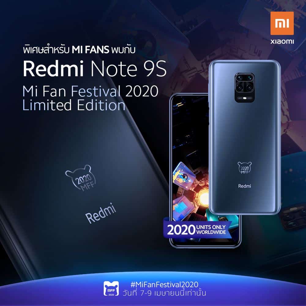 และในช่วงเทศกาล MFF เสียวหมี่จะเปิดตัว Redmi Note 9S รุ่น MFF-limited edition ซึ่งมีจำนวนจำกัดเพียงแค่ 2020 เครื่องทั่วโลกเท่านั้น โดยจำหน่ายใน ราคา 7,999 บาท ผ่านช่องทาง Lazada, Shopee และ JD Central ในวันที่ 7 เมษายน 2563 นี้