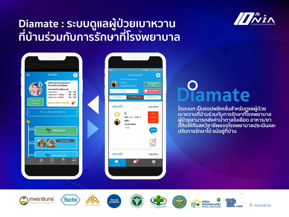ผู้ป่วยโรคเบาหวานและความดันถือเป็นอีกกลุ่มเสี่ยงที่อาจเกิดภาวะรุนแรงหากติดเชื้อโควิด – 19 ซึ่งในช่วงนี้จำเป็นต้องดเว้นจากสถานที่ที่มีความแออัด โดยเฉพาะในโรงพยาบาลเพื่อหลีกเลี่ยงกับการรับเชื้อไวรัสจากกลุ่มคนต่าง ๆ ที่เข้ามาใช้บริการในสถานที่เดียวกัน Diamate จึงเป็นแอปพลิเคชันที่ตอบโจทย์การดูแลผู้ป่วยเบาหวานที่บ้าน ร่วมกับการรักษาที่โรงพยาบาล ซึ่งระบบดังกล่าวจะช่วยดูแลผู้ป่วยเบาหวานหลังจากรักษาตัวในโรงพยาบาล ด้วยการใช้แอปพลิเคชันรับคำแนะนำการปฏิบัติตัวจากทีมนักโภชนาการ ซึ่งเป็นทีมเดียวกับแพทย์ผู้ให้การรักษาที่โรงพยาบาลนั้นๆ การให้คำแนะนำการปฏิบัติตัวในแต่ละวัน นอกจากนี้ระบบยังสามารถเชื่อมต่อกับผู้ป่วยที่มีเครื่องเจาะน้ำตาลปลายนิ้ว ทำให้ช่วยติดตามระดับน้ำตาลของผู้ป่วยได้แบบเรียลไทม์พร้อมแจ้งเตือนเมื่อเกิดความผิดปกติได้อย่างทันท่วงที