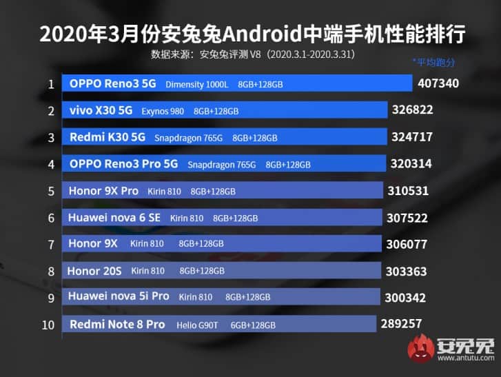 นอกจากนี้สำหรับในตารางของสมาร์ทโฟนกลุ่มระดับกลาง (Mid-range) อันดับ 1 เป็นของ OPPO Reno3 5G ใช้ชิปเซ็ตเป็น Dimensity 1000L ที่ทำคะแนนได้มากกว่า 400,000 คะแนน รองลงมาเป็น Vivo X30 5G ที่ใช้ Exynos 980