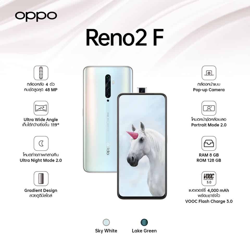 เพราะ OPPO Reno2 F นั้น มาพร้อมจุดเด่นมากมาย ไม่ว่าจะเป็น กล้องหลัง 4 ตัว กับความละเอียดสูงสุด 48MP สเปคเร็วแรงด้วย RAM 8GB และ ROM 128GB ทำให้สามารถใช้งานสมาร์ทโฟนได้อย่างลื่นไหลเต็มประสิทธิภาพ ไม่ว่าจะเป็นการใช้งานแอพพลิเคชั่นต่างๆ การดูวิดีโอ หรือ เล่นเกมได้อย่างต่อเนื่องไม่มีสะดุด และยังมาพร้อมหน้าจอแบบ Panoramic ที่กว้างเต็มตาขนาด 6.5 นิ้ว พร้อมดีไซน์สวยเรียบหรูที่มีให้เลือกถึง 3 สี คือ สีขาว Sky White, สีเขียว Lake Green และสีสุดพิเศษอย่าง Nebula Green นอกจากนี้ยังรองรับเทคโนโลยีชาร์จไว VOOC 3.0 พร้อมแบตเตอรี่ 4,000 mAh อีกด้วย
