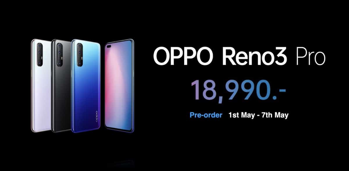 OPPO Reno3 Pro เปิดตัว ด้วยราคา 18,990 บาท โดยจะเริ่มให้สั่งจองล่วงหน้า Pre-Order ได้ตั้งแต่วันที่ 1-7 พฤษภาคม 2563 เป็นต้นไป โดยผู้ที่สั่งจอง จะได้รับของสมนาคุณพิเศษ