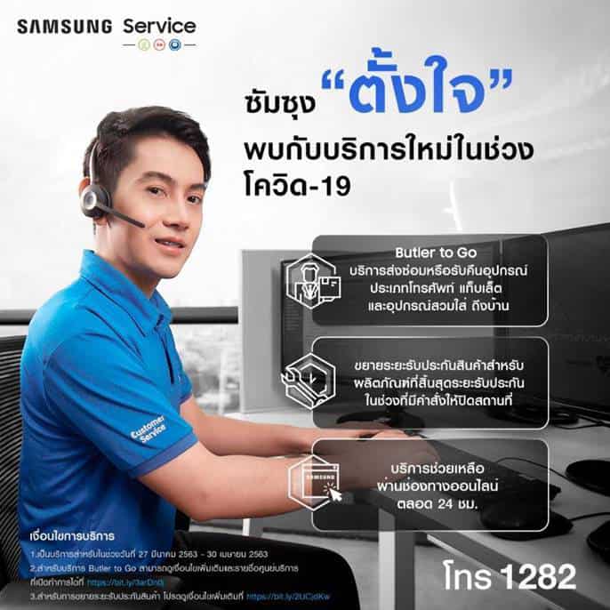- บริการดิจิทัลเซอร์วิสเพื่ออำนวยความสะดวกให้แก่ลูกค้าที่ต้องการใช้บริการซ่อมผลิตภัณฑ์ ซัมซุงจึงได้เปิดช่องทางการติดต่อออนไลน์แก่ลูกค้าของซัมซุงและผู้ที่สนใจใช้บริการหรือต้องการข้อมูลเพิ่มเติม ไม่ว่าจะเป็นการติดต่อสอบถามผ่านทางคอลเซ็นเตอร์ของซัมซุงเบอร์ 1282 หรือผ่านทาง Live chat ที่ https://www.samsung.com/th/support/ และแอปพลิเคชัน Samsung Members เพื่อปรึกษา ผู้เชี่ยวชาญซึ่งผ่านการอบรมจากซัมซุงแล้วเป็นอย่างดีได้ตลอด 24 ชั่วโมง และตรวจสอบเงื่อนไข การรับประกันสินค้าได้ที่ https://www.samsung.com/th/support/warranty/ สามารถใช้บริการทั้ง 3 ของซัมซุงได้ตั้งแต่วันนี้ จนถึงวันที่ 30 เมษายน 2563 นี้!