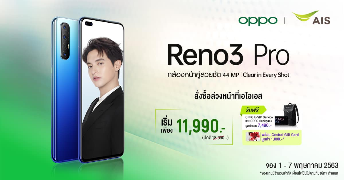 ลูกค้าเอไอเอส สามารถจอง OPPO Reno3 Pro ในราคาเริ่มต้นเพียง 11,990 บาท จากราคาปกติ 18,990 บาท รับฟรี OPPO E-VIP Service รับประกันหน้าจอนาน 1 ปี, กระเป๋าสุดเท่ OPPO Backpack และ Central Gift Card มูลค่ารวมถึง 8,490 บาท พร้อมรับเพิ่มฟรี! สิทธิดู AIS PLAY FAMILY ฟรี 6 เดือน* โดยสามารถจองได้แล้วตั้งแต่วันที่ 1 – 7 พฤษภาคม 2563 ทางเว็บไซต์ www.ais.co.th/opporeno3, AIS Online Store, Line@AISShop หรือที่ AIS Shop และร้านเทเลวิซทุกสาขาทั่วประเทศ โดยจะได้รับสินค้าตั้งแต่วันที่ 8 พฤษภาคม 2563 เป็นต้นไป ทั้งนี้ สามารถรับข้อเสนอสุดเอ็กซ์คลูซีฟกับเอไอเอส เฉพาะช่วงสั่งซื้อเครื่องล่วงหน้าเท่านั้น! สอบถามข้อมูลเพิ่มเติมที่ AIS Contact Center 1175