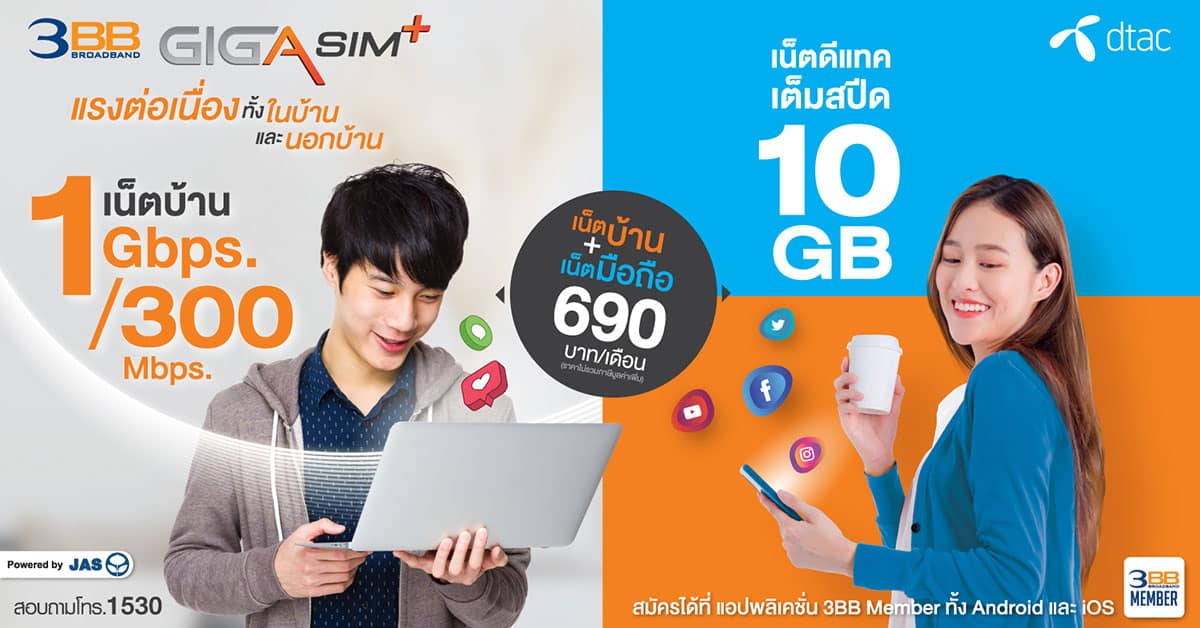 ทาง 3BB จึงจับมือพาร์ทเนอร์กับ dtac ออกแพ็กเกจใหม่ มีทั้งเน็ตบ้านความเร็ว 1 Gbps พร้อมเน็ตมือถือ 10 GB เพื่อตอบสนองความต้องการของกลุ่มผู้ใช้มีความต้องการใช้อินเทอร์เน็ตอย่างต่อเนื่อง