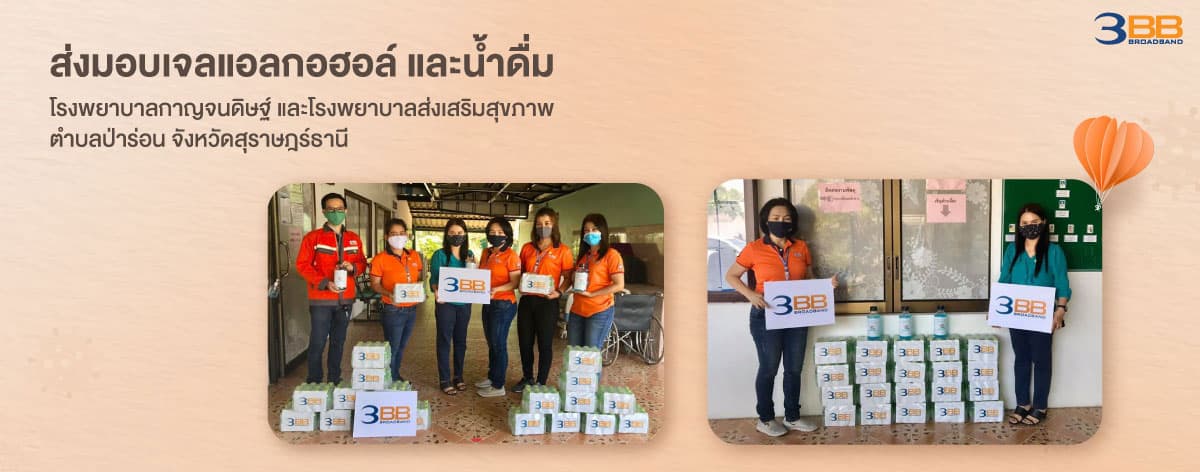 สนับสนุนอุปกรณ์ทางการแพทย์ให้กับโรงพยาบาลในจังหวัดสุราษฎร์ธานีและจังหวัดชุมพรอุปกรณ์ทางการแพทย์ยังคงเป็นสิ่งจำเป็นสำหรับโรงพยาบาลทุกแห่ง 3BB ประจำจังหวัดสุราษฎร์ธานี จึงได้มอบเจลแอลกอฮอล์และน้ำดื่มให้แก่โรงพยาบาลกาญจนดิษฐ์ และโรงพยาบาลส่งเสริมสุขภาพตำบล ป่าร่อน อำเภอกาญจนดิษฐ์ จังหวัดสุราษฎร์ธานีสำหรับแพทย์และบุคลากรทางการแพทย์ได้ใช้ประโยชน์ต่อไป