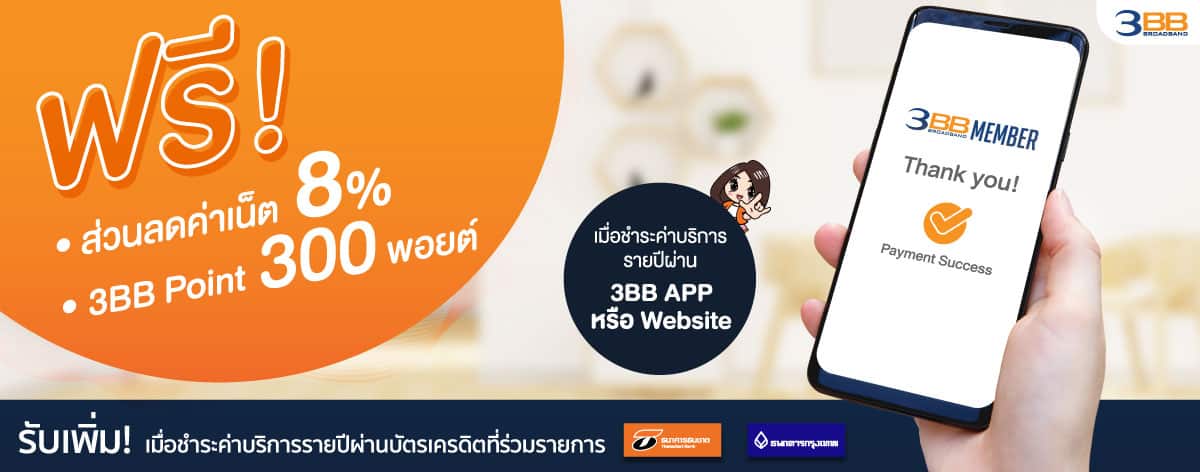 ลูกค้า 3BB ไม่ต้องกังวลกับการต้องไปชำระค่าบริการ เมื่อสมัครชำระค่าบริการล่วงหน้าแบบรายปี รับส่วนลดและของสมนาคุณแบบปังๆ สูงสุดถึง 3 ต่อด้วยกันโดยลูกค้าสามารถสมัครชำระค่าบริการรายปี ผ่านช่องทางใดก็ได้