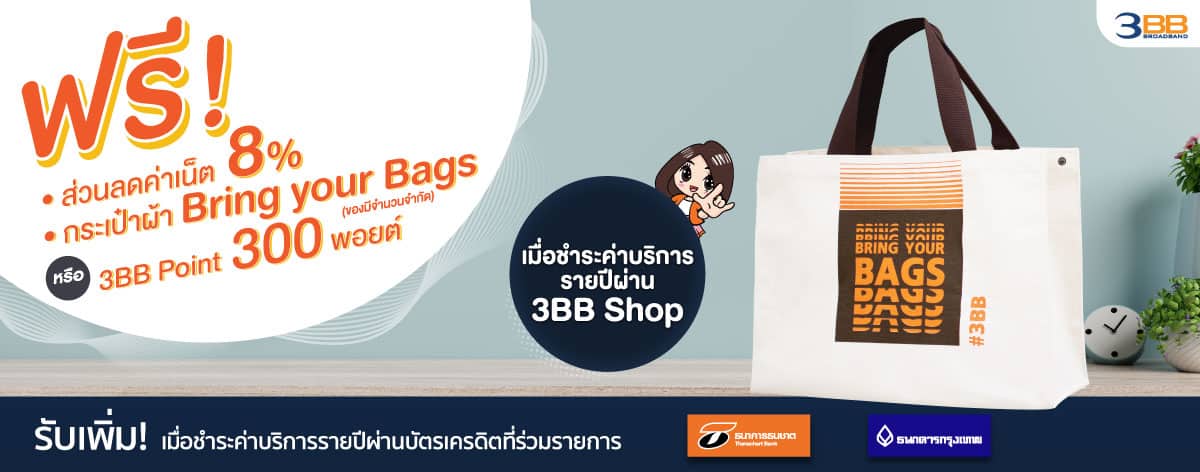 และรับสิทธิพิเศษเพิ่มเติมจากธนาคารกรณีชำระด้วยบัตรเครดิตธนาคารกรุงเทพ บัตรเครดิตธนชาต และ/หรือบัตรเครดิตนครหลวงไทยแล้วยังสามารถเลือกรับโบนัสพอยต์จาก 3BB จำนวน 300 พอยต์ หรือกระเป๋าผ้า Bring Your Bag ที่ผลิตขึ้นเพื่อลูกค้า 3BB โดยเฉพาะ