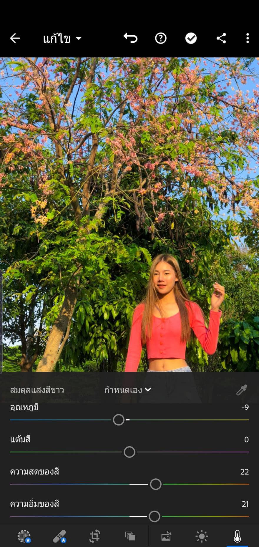 เราจะเริ่มจากเข้าเมนูปรับ สี ปรับลดอุณหภูมิ แล้วปรับเร่งความสดของสี กับความอิ่มของสี ปรับตามรูปตัวอย่างได้เลยค่ะ แนะนำว่าปรับแต่พอดีก่อนเพราะยังมีอีกหลายขั้นตอน