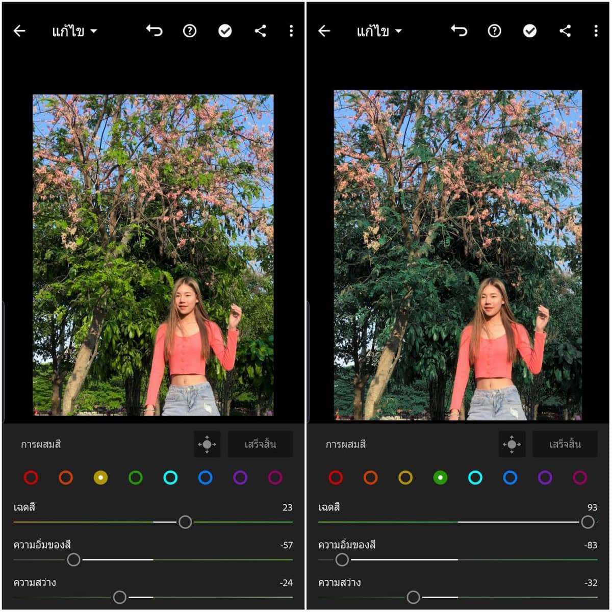 - ปรับมิกซ์สี ส่วนของสีเขียวเร่งเฉดสีเพิ่มให้เต็มที่ แล้วลดความอิ่มและความสว่างลง ส่วนโทนสีอื่นปรับให้เหมาะกับส่วนอื่นๆ ในภาพไม่ให้สีเพี้ยน