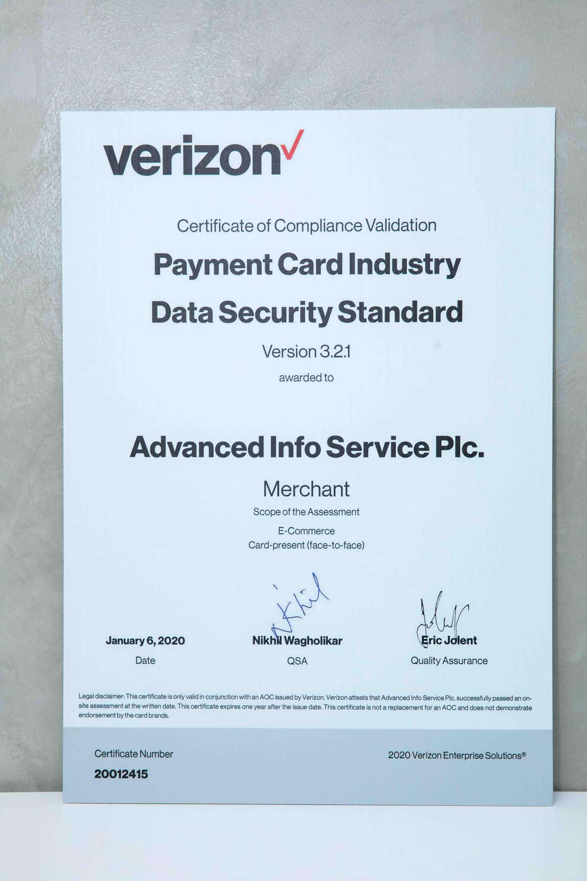 เอไอเอส มีความภาคภูมิใจเป็นอย่างยิ่ง ที่ผ่านการรับรองมาตรฐาน PCI DSS ต่อเนื่องเป็นปีที่ 3 ซึ่งมาตรฐานที่ได้รับในครั้งนี้จะทำให้ลูกค้ามั่นใจและไว้วางใจในการชำระเงินด้วยบัตร ผ่านทุกช่องทางของเอไอเอส ทั้ง Online และ Physical อาทิ AIS Shop, Telewiz, AIS Payment Kiosk, myAIS App, myAIS Web, mPay station และ IVR Call Center การเติมเงิน และการชำระค่าบริการรายเดือนผ่านระบบตัดบัตรอัตโนมัติ