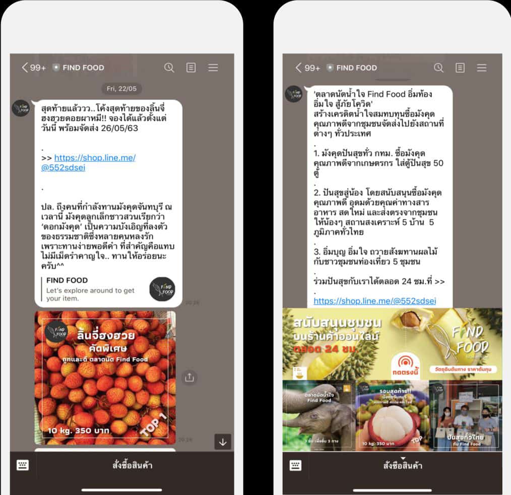แพลตฟอร์ม Find Food สามารถใช้ช่องทางดิจิทัลอย่าง LINE มาแก้สถานการณ์ได้มีประสิทธิภาพ โดยยึดเอา LINE Official Account เป็นช่องทางหลักทั้งในด้านการสื่อสารตรงกับผู้บริโภค เพิ่มศักยภาพด้านการขาย ผู้บริโภคสามารถซื้อผลิตผลทางการเกษตรได้ทันทีผ่าน LINE พร้อมด้วยเครื่องมือ MyShop ที่มีระบบสร้างหน้าร้านออนไลน์ และระบบดูแลสินค้าหลังบ้านที่ทรงประสิทธิภาพและง่ายต่อการใช้งาน ส่งผลให้ LINE Official Account ของ Find Food (@findfood19) ประสบความสำเร็จสามารถช่วยเหลือเกษตรกรรายย่อยให้สามารถขยายช่องทางธุรกิจสู่การเกษตรดิจิทัลและก้าวเข้าสู่การเกษตรในยุค New Normal อย่างมั่นใจ
