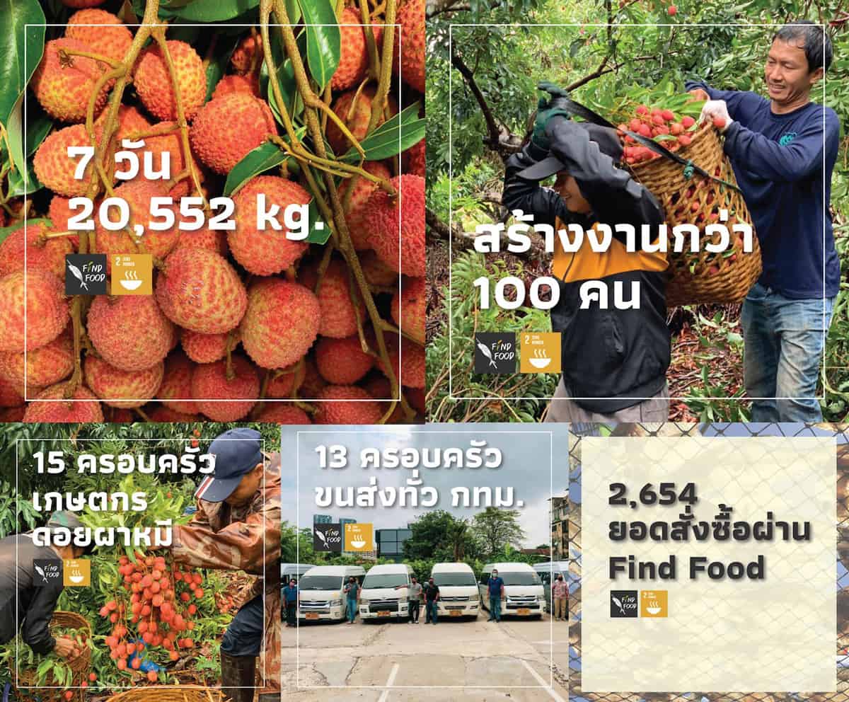 ตัวอย่างกรณีที่ประสบความสำเร็จ อาทิ การส่งออกลิ้นจี้สดจากดอยผาหมี จังหวัดเชียงราย ที่มียอดสูงกว่า 2 หมื่นกิโลกรัม จากยอดการสั่งซื้อ 2,654 รายการภายใน 7 วัน สร้างงานให้กับคนในชุมชนกว่า 100 คน แบ่งเป็น 15 ครอบครัวที่ทำการเกษตรและ 13 ครอบครัวที่ดำเนินการขนส่งสินค้า โดยล่าสุด Find Food สามารถช่วยชุมชนระบายผลผลิตทางการเกษตรไปแล้วกว่า 30 ตัน และสร้างรายได้ให้กับชุมชนต่างๆ ไปแล้วเกือบล้านบาทในช่วงเดือนเมษายนที่ผ่านมา