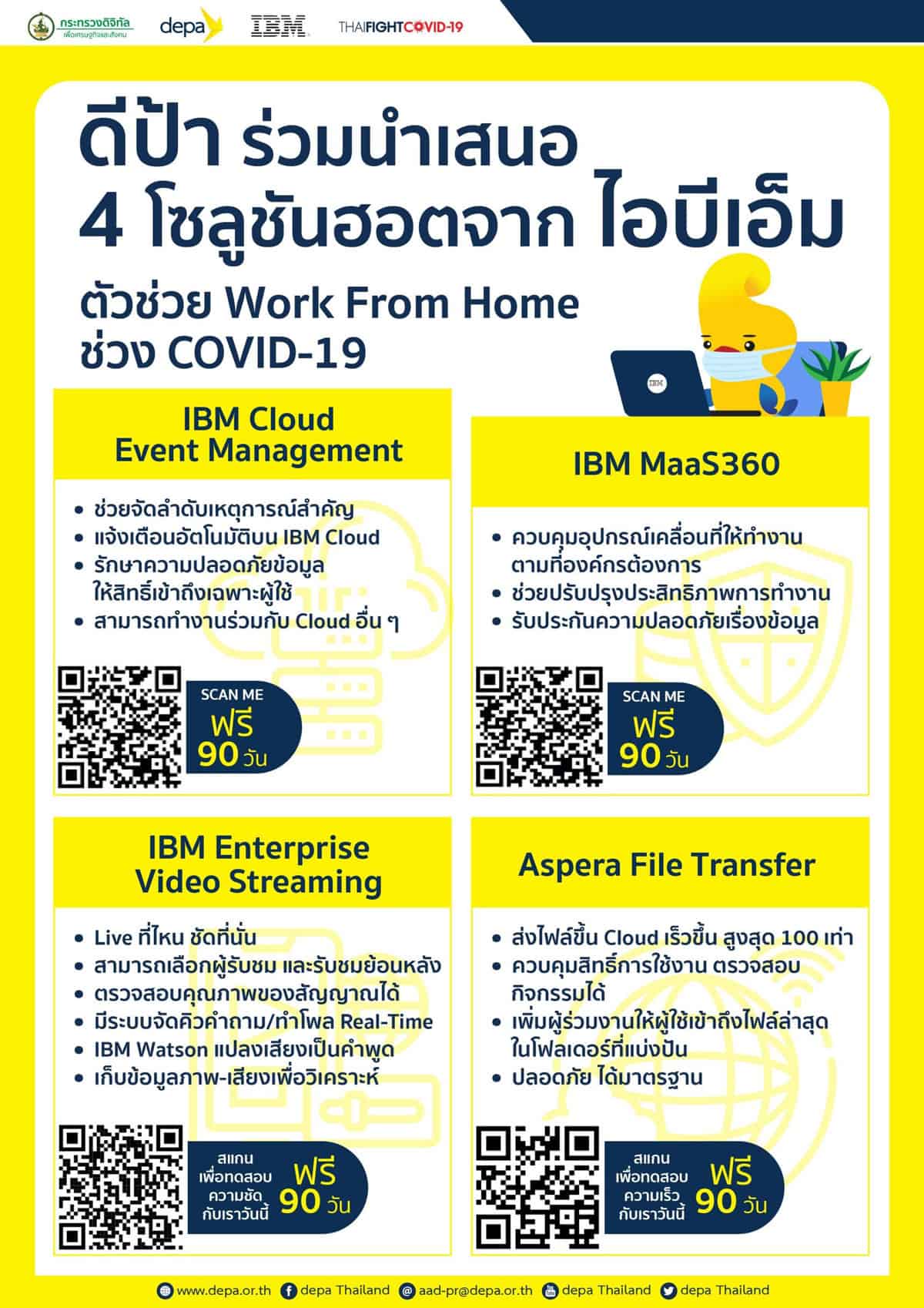 กระทรวงดิจิทัลเพื่อเศรษฐกิจและสังคม โดย สำนักงานส่งเสริมเศรษฐกิจดิจิทัล หรือ ดีป้า (DEPA) จับมือ ไอบีเอ็ม ประเทศไทย นำเสนอ 4 โซลูชัน ตอบโจทย์ Work From Home พร้อมอำนวยความสะดวกในการทำงาน และให้บริการด้านดิจิทัล ท่ามกลางสถานการณ์การแพร่ระบาดของเชื้อ COVID-19 สามารถทดลองใช้ฟรี 90 วันได้แล้ววันนี้