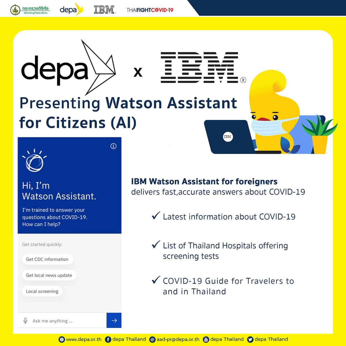 นอกจากนี้ ดีป้า และ ไอบีเอ็ม ประเทศไทย ยังได้ร่วมกันพัฒนาระบบ Watson Assistant for Citizens (AI) โดยมีวัตถุประสงค์ให้ชาวต่างชาติที่อยู่ในประเทศไทยสามารถสอบถาม ค้นหาข้อมูลต่าง ๆ และรับคำแนะนำเกี่ยวกับ COVID-19 เป็นภาษาอังกฤษ อาทิ แนวทางการป้องกัน การรักษา การกักตัว สถานที่ตรวจหาโรค ข้อกำหนดการเดินทาง ตลอดจนประกาศ / คำสั่งของรัฐบาลไทยจากหลากหลายแหล่ง เช่น ศูนย์บริหารสถานการณ์การแพร่ระบาด COVID-19 กรมควบคุมโรค สถาบันวิจัยวิทยาศาสตร์สาธารณสุข องค์การอนามัยโลก ศูนย์ควบคุมและป้องกันโรคแห่งสหรัฐอเมริกาที่สามารถให้ข้อมูลได้อย่างแม่นยำและเชื่อถือได้ ซึ่ง ไอบีเอ็ม ประเทศไทย มีความพร้อมที่จะพัฒนาระบบต่อเนื่องในอนาคต
