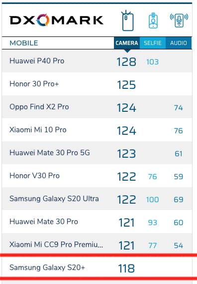 DxOMark ประกาศคะแนน รีวิว กล้องหลังของ Samsung Galaxy S20+ ออกมาแล้วที่ 118 คะแนน อยู่ที่อันดับ 10 ของสมาร์ทโฟนทั้งหมด