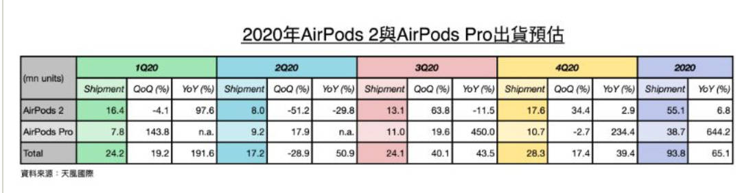 โดย Kuo กล่าวว่า การส่งออก AirPods ในช่วงไตรมาสที่ 2 นั้นน่าจะลดลงต่ำสุด เนื่องจากผลกระทบจากสถาการณ์โควิด-19 โดยยอดส่งออกนั้นลดลงถึง 29% จากไตรมาสก่อนหน้านี้ คิดเป็นจำนวน 17.2 ล้านคู่ในไตรมาสที่ 2 นี้