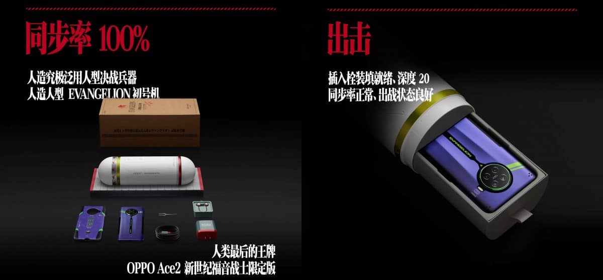 เริ่มด้วยตัวเครื่อง OPPO Ace2 EVANGELION Limited Edition สีจะเป็นสีม่วงตัดกับเขียวและดำ ซึ่งเป็นสีธีมของ EVA-01 หุ่นตัวเอกของเรื่อง โดยตัวแพ็กเกจออกแบบมาเป็นกระบอกทรงกลมที่อิงมาจาก Entry Plug ห้องบังคับของหุ่นในเรื่อง