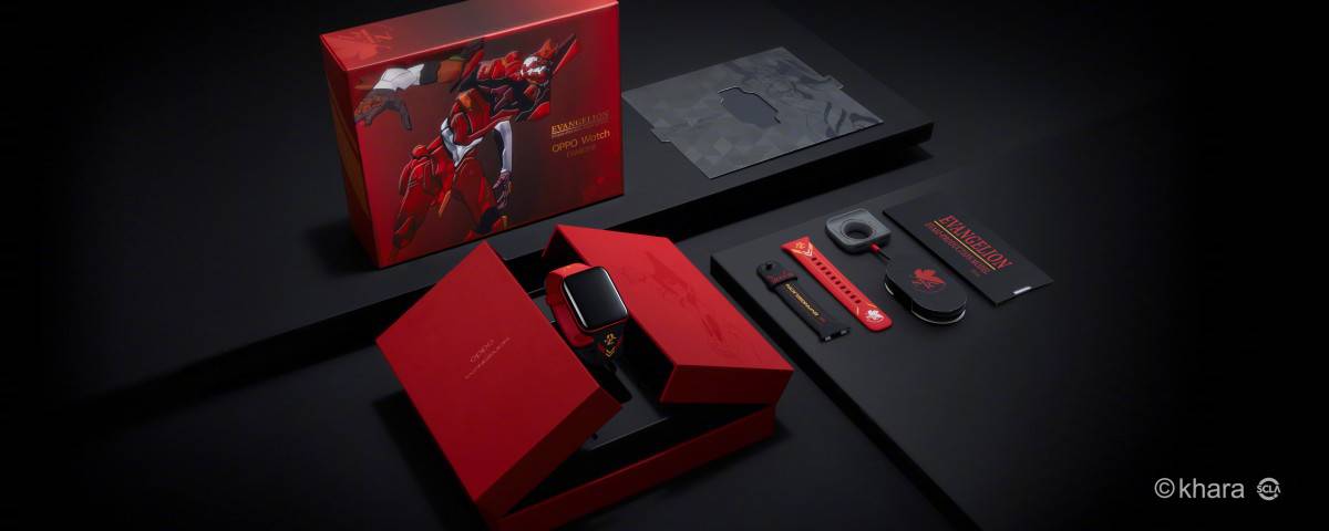 และรอบนี้ ออปโป้ไม่ได้ส่งมาแค่สมาร์ทโฟน แต่ยังมีอย่างอื่นที่อยู่ในธีมของ EVANGELION ด้วย นั่นคือ นาฬิกา OPPO Watch ที่ดีไซน์จะเป็นโทนสีแดงดำ ซึ่งออกแบบตามตัวหุ่น EVA-02 อีกตัวเอกสำคัญในเรื่อง (ตัวหุ่นจะพิมพ์อยู่ด้านหน้า)