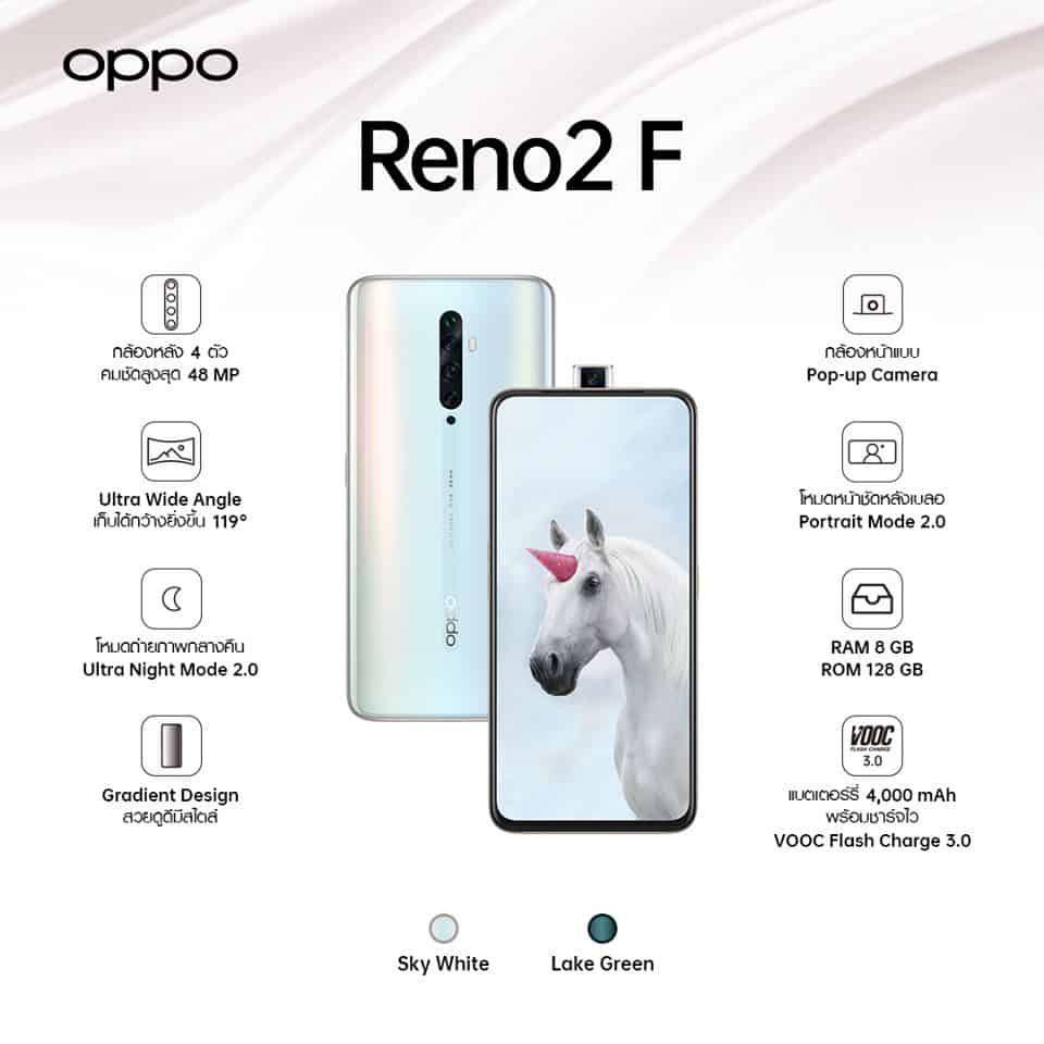 OPPO Reno2 F มีจุดเด่นอยู่ที่กล้องหลัง 4 ตัวความละเอียดสูงสุด 48MP พร้อมฟังก์ชั่นต่างๆ ที่ช่วยให้การถ่ายภาพเป็นเรื่องง่าย กล้องหน้าเองก็ไม่แพ้กันเลยยังคงคอนเซ็ปเซลฟี่สวยเป็นธรรมชาติด้วย A.I. Beauty แบบใหม่ และยังมี Selfie Portrait ที่ถ่ายหน้าชัดหลังละลายได้ นอกจากนี้ยังมาพร้อมแบตเตอรี่ความจุ 4,000 mAh, เทคโนโลยีชาร์จไว VOOC 3.0, หน้าจอ Panoramic Screen 6.5 นิ้ว RAM 8GB และ ROM 128GB โดย OPPO Reno2 F มีให้เลือก 3 สี คือ สีเขียว Nebula Green, สีขาว Sky White และ สีเขียว Lake Green