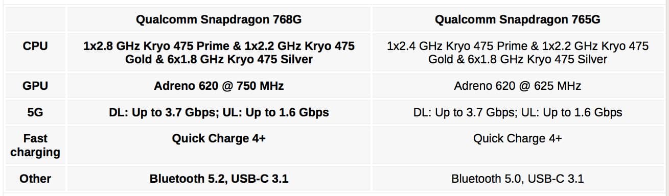 Snapdragon 768G พัฒนาขึ้นจาก Snapdragon 765G โดย Qualcomm Kryo 475 CPU ที่แรงขึ้นถึง 2.8 GHz และ Qualcomm Adreno 620 GPU ที่แรงขึ้นเป็น 725 MHz