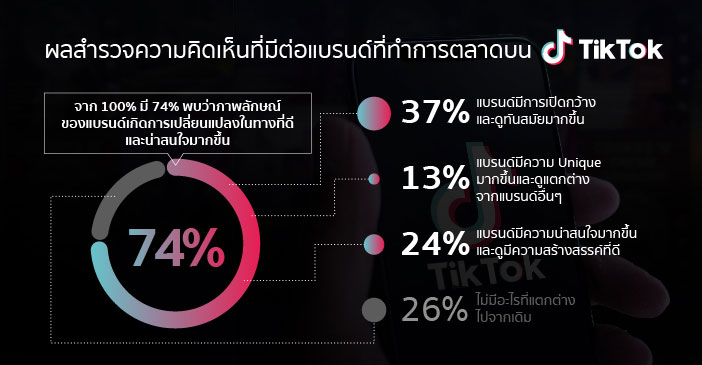 TikTok มีการเผยข้อมูลผลสำรวจความคิดเห็นของผู้บริโภคที่มีต่อแบรนด์ และพบว่าจากการสำรวจ 100% มี 74% ที่เห็นว่าภาพลักษณ์ของแบรนด์เกิดการเปลี่ยนแปลงไปในทางที่ดีและน่าสนใจมากขึ้นหลังจากมาทำการตลาดบน โดยแบ่งเป็น 37% เห็นว่าแบรนด์มีการเปิดกว้างและดูทันสมัยมากขึ้น และ 13% เห็นว่าแบรนด์มีความ Unique มากขึ้นและดูแตกต่างจากแบรนด์อื่นๆ และ 24% มองว่า แบรนด์มีความน่าสนใจมากขึ้นและดูมีความสร้างสรรค์ที่ดี ขณะที่อีก 26% รู้สึกว่าไม่มีอะไรที่แตกต่างไปจากเดิม