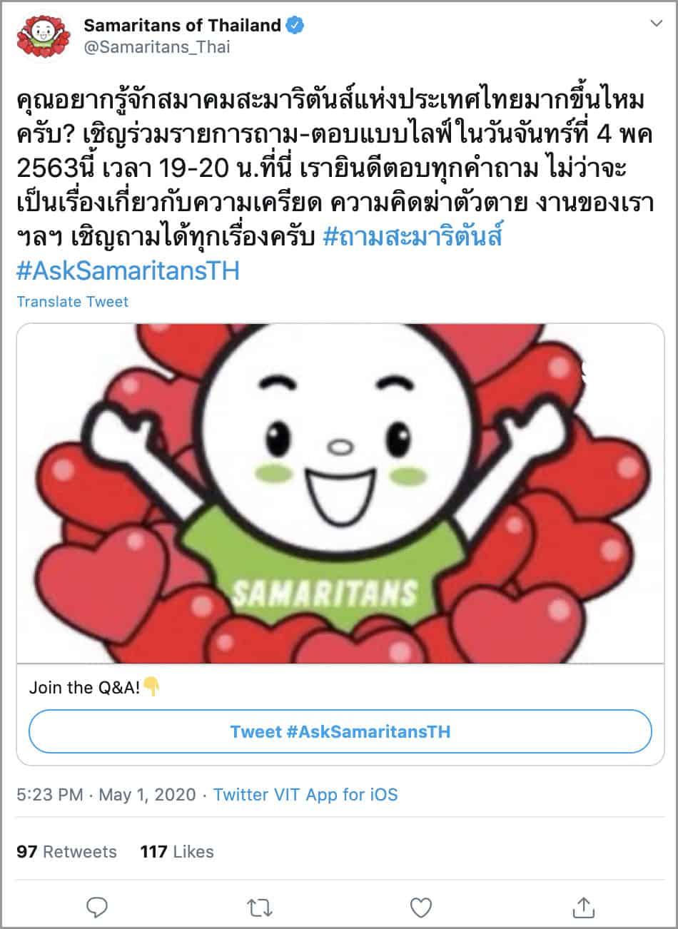 ทวิตเตอร์ร่วมเป็นพันธมิตรกับสมาคมสะมาริตันส์แห่งประเทศไทย(@Samaritans_Thai) เนื่องในวันสุขภาพจิตสากล โดยเปิดตัวบริการแจ้งเตือน #ThereIsHelp ขึ้นในประเทศไทยเพื่อป้องกันการฆ่าตัวตายและการทำร้ายตัวเอง ซึ่งล่าสุดทวิตเตอร์ได้จัดให้มีช่วงถาม-ตอบกับสมาคมสะมาริตันส์แห่งประเทศไทย เพื่อให้เกิดความเข้าใจเกี่ยวกับสุขภาพจิตในช่วงของสถานการณ์ของโควิด-19 ที่เป็นเวลาแห่งความท้าทายสำหรับทุกคนที่อาจพบกับความยากลำบาก