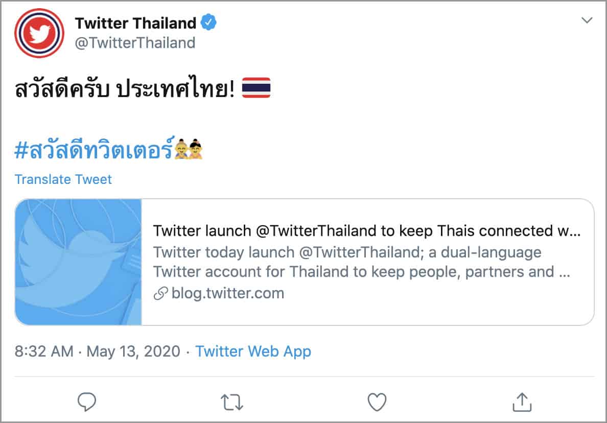 @TwitterThailand แอคเคาท์ทวิตเตอร์ประเทศไทยอย่างเป็นทางการ ในแบบสองภาษาเพื่อให้คนไทย เชื่อมโยงและติดตามสิ่งที่กำลังเกิดขึ้นหรือ #WhatsHappening ทั้งในประเทศไทยและทั่วโลก ไม่ว่าจะเป็นเรื่องของวงการบันเทิง กีฬา รายการโทรทัศน์ ไปจนถึงการบอกเล่าเหตุการณ์ต่างๆ แบบเรียลไทม์ สถานการณ์การแพร่ระบาดของไวรัสโควิด-19, เทศกาลสำคัญของคนไทยอย่าง #สงกรานต์ และโมเมนต์ของป๊อบคัลเจอร์