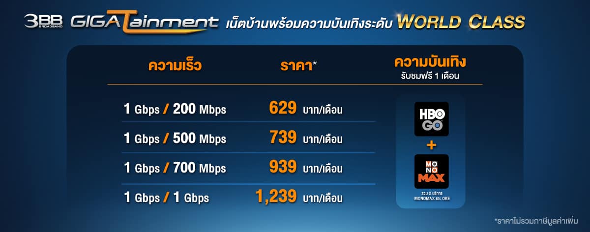ในช่วงปลายไตรมาสที่ 1/2563 3BB ได้ออกแพ็กเกจเน็ตบ้านพร้อมความบันเทิงในนาม GIGATainment และโดยให้ความเร็วขั้นต่ำที่ 1Gbps พร้อมสิทธิ์ดู HBO GO และ MONOMAX 1 เดือน โดยมีความเร็วให้เลือก 4 แพ็กเกจตามความต้องการใช้งาน