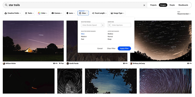 การสร้างแรงบันดาลใจอีกทางคือการดูงานที่คล้ายกับสิ่งที่กำลังทำอยู่ บน Behance เราจะได้เห็นผลงานที่ครีเอเตอร์มาแชร์ให้ชมกันมากกว่า 21 ล้านชิ้น คุณสามารถค้นหาผลงานเหล่านั้นได้ง่ายยิ่งขึ้น ด้วยเครื่องมือการค้นหาที่พัฒนาใหม่ คุณสามารถค้นหารูปที่ต้องการ โดยระบุลักษณะเฉพาะของภาพ องค์ประกอบที่โดดเด่น หรือการค้นหาจากภาพ GIFs ได้ ช่างภาพสามารถค้นหารูปได้ละเอียดถึงขั้นระบุว่าต้องการรูปที่ใช้รูรับแสงหรือความยาวโฟกัสขนาดเท่าไหร่ หรือแม้แต่การหารุ่นของกล้องที่ใช้ถ่ายรูป