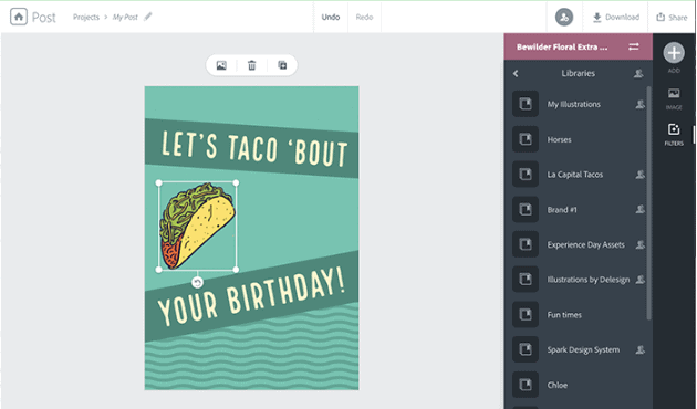 ความสร้างสรรค์ในธุรกิจแบบใหม่ไม่ได้จำกัดว่าจะต้องมีทีมออกแบบและสตูดิโออีกต่อไป เพราะการก่อตั้งบริษัท ออกแบบแนวทางการทำธุรกิจ รวมทั้งการสร้างการรับรู้ให้กับแบรนด์ จำเป็นต้องอาศัยความคิดสร้างสรรค์และความร่วมมือของคนในทีม เพื่อวางรากฐานและพัฒนาองค์กรให้ก้าวหน้ายิ่งขึ้น เพื่อสนับสนุนประเด็นดังกล่าวอะโดบีจึงเพิ่มความสามารถ Creative Cloud Libraries ให้ครอบคลุมไปใช้งานบน Spark ได้ด้วย โดยใน Libraries ทีมออกแบบสามารถแชร์ฟอนท์ สี โลโก้ และการออกแบบต่าง ๆ ที่ได้รับการอนุมัติจากบริษัท เพื่อให้มั่นใจว่าสิ่งที่เพื่อนร่วมงานได้สร้างขึ้นมานั้นเป็นสิ่งที่สะท้อนภาพลักษณ์ขององค์กร