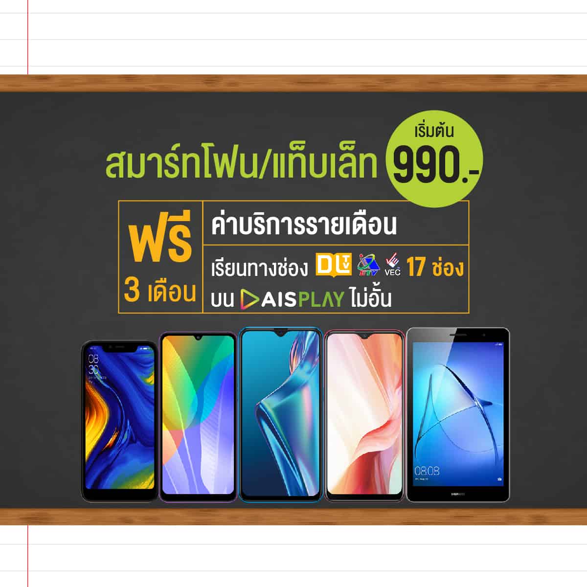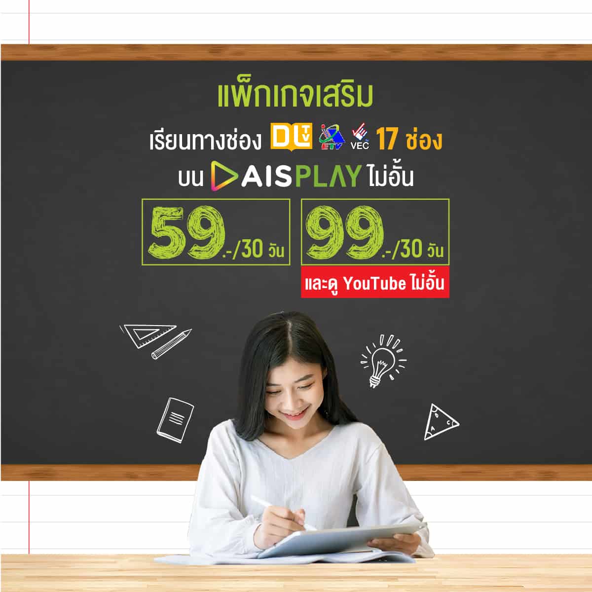 1. แพ็กเกจเสริมบนมือถือ สำหรับลูกค้ามือถือเอไอเอส ทั้งระบบเติมเงินและรายเดือน รับชมช่องเพื่อการศึกษา DLTV, VEC TV และ ETV ครบทั้ง 17 ช่อง บนแอป AIS PLAY เริ่มต้นพียง 59 บาท ใช้งานได้ไม่จำกัด นาน 30 วัน และแพ็กเกจสุดคุ้ม รับชม AIS PLAY และการค้นหาความรู้ด้านการศึกษาผ่าน YouTube ได้ไม่จำกัด เหมาจ่ายเพียง 99 บาท ใช้งานรายเดือนต่อเนื่อง 30 วัน