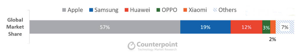 จากรายงานของบริษัทวิเคราะห์ข้อมูลอย่าง Counterpoint ช่วงไตรมาสแรกของปี 2020 เผยว่า สมาร์ทโฟนระดับพรีเมียม (สมาร์ทโฟนที่มีราคาเกินกว่า 400 ดอลล่าร์ หรือประมาณ 12,440 บาท) มียอดขายลดลงถึง 13% เมื่อเทียบกับช่วงเวลาเดียวกันในปีที่แล้ว ซึ่งสาเหตุที่ทำให้ตลาดสมาร์ทโฟนทั่วโลกซบเซาหลักๆ มาจากการระบาดของ COVID-19 แต่ที่น่าสนใจก็คือ Apple เป็นผู้นำและสามารถกวาดส่วนแบ่งตลาดกลุ่มนี้ไปได้ถึง 57% ตามมาด้วย Samsung และ Huawei