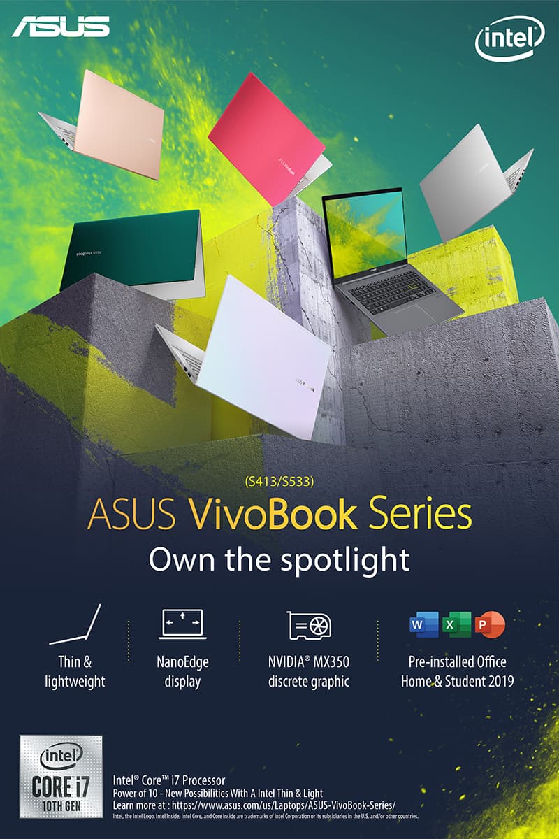 New Asus VivoBook Series ขนาด 14 นิ้ว (S413) น้ำหนักเครื่องเพียง 1.4 กก. (บาง 17.9 มม.) พร้อมนวัตกรรมขอบจอบาง ให้สัดส่วนจอต่อตัวเครื่องสูงถึง 86% และ VivoBook ขนาด 15.6 นิ้ว (S533) น้ำหนักเครื่อง 1.8 กก. (บาง 16.1 มม.) สำหรับคนที่มองหาโน้ตบุ๊กสำหรับการพกพา หรือเน้นพื้นทื่หน้าจอในการทำงาน ชูประสิทธิภาพครอบคลุมทุกการทำงานด้วยโปรเซสเซอร์ 10th Gen Intel สูงสุด Core i7 ที่มาพร้อมการ์ดจอ NVIDIA GeForce MX350, พื้นที่เก็บข้อมูลสูงถึง 512GB PCIE SSD และหน่วยความจำ ระบบระบายความร้อนที่สะอาดและการอัพเกรดที่ทำได้ง่าย DDR4 8GB พร้อม WiFi 6 (802.11ax) ให้การเชื่อมต่อรวดเร็วยิ่งขึ้นถึง 3 เท่า