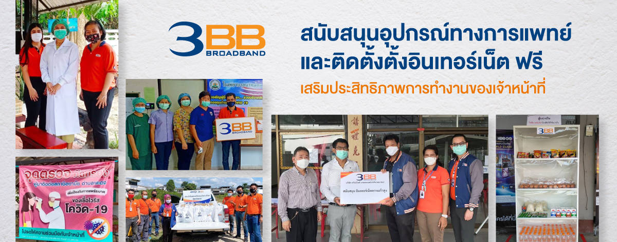 3BB ยังได้มอบอุปกรณ์ทางการแพทย์ เช่น หน้ากากอนามัย เจลแอลกอฮอล์ แก่โรงพยาบาลหลายแห่ง เพื่อให้แพทย์-พยาบาลซึ่งถือเป็นด่านหน้าในการรับมือกับเชื้อโรคได้นำมาใช้ในช่วงเวลาที่สำคัญตั้งแต่เริ่มมีการะบาดของเชื้อเป็นต้นมาจนถึงปัจจุบันที่แม้ว่าจะพ้นจากภาวะการขาดแคลนลงบ้างแล้วก็ตาม รวมถึงการแบ่งปันน้ำใจมอบสิ่งของเครื่องใช้อุปโภค บริโภคที่จำเป็นต่อการดำรงชีพให้กับผู้ที่ได้รับผลกระทบในหลายพื้นที่ เพื่อเป็นกำลังใจให้ทุกคนสามารถก้าวผ่านวิกฤตครั้งนี้ไปได้ด้วยกัน