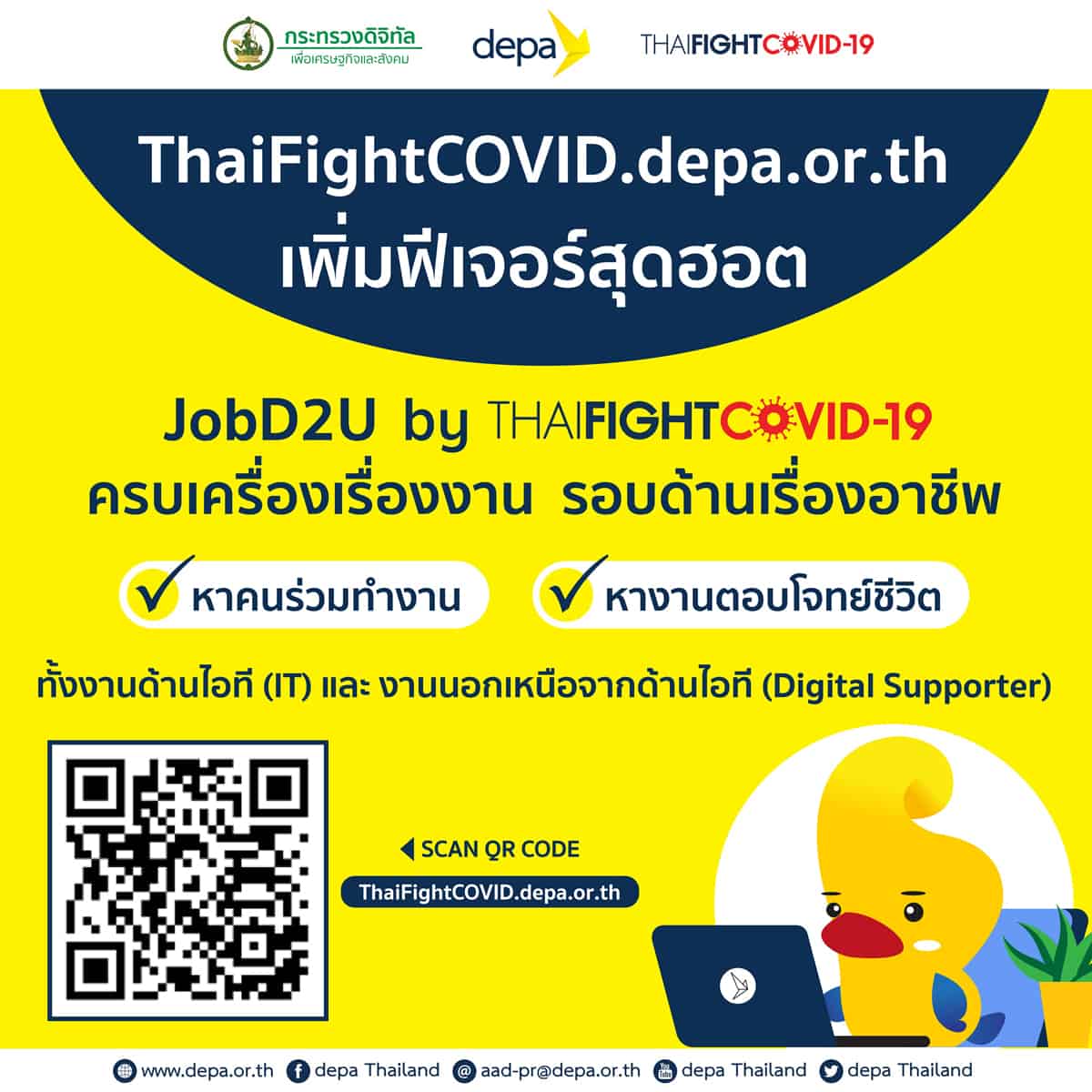 สำนักงานส่งเสริมเศรษฐกิจดิจิทัล หรือ ดีป้า ในฐานะผู้พัฒนาแพลตฟอร์ม ThaiFightCOVID เพิ่ม 2 ฟีเจอร์ใหม่ เพื่อให้สอดคล้องกับยุคหลังพ้นวิกฤตโควิด-19 ประกอบด้วยฟีเจอร์ JobD2U by ThaiFightCOVID-19 พื้นที่หางานออนไลน์ ช่วยเหลือคนตกงาน ว่างงาน และฟีเจอร์เสริมทักษะสร้างอาชีพ สำหรับผู้ที่กำลังมองหาแหล่งเรียนรู้เพื่อเพิ่มโอกาสในการประกอบอาชีพ หรือ สร้างธุรกิจเป็นนายตนเอง