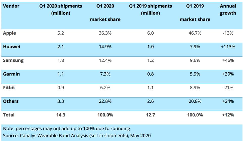 จากข้อมูลของ canalys ยอดส่งออกขายสมาร์ทวอชทั่วโลกทำได้ถึง 14.3 เรือนในไตรมาสที่ 1 ปี 2020 โตขึ้นถึง 12% แม้จะอยู่ในช่วงที่ COVID-19 ระบาด