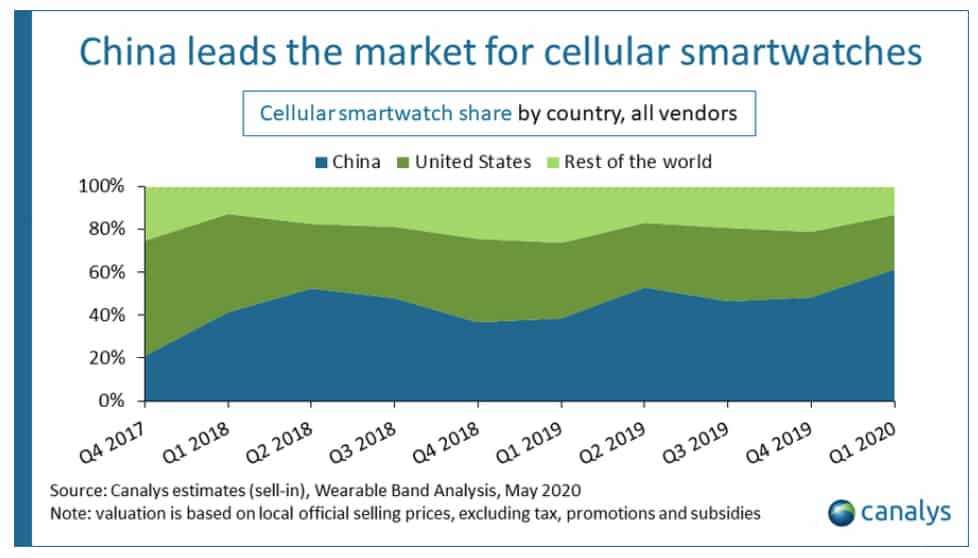 ส่วนยอดการส่งออกขายสมาร์ทวอชในประเทศจีนในไตรมาสที่ 1 ปี 2020 โตขึ้นถึง 66% ซึ่งถือเป็นคู่แข่งที่สำคัญของฝั่งอเมริกาเหนือ โดย Cynthia Chen นักวิเคราะห์ของ canalys กล่าวว่า ทางผู้ขายได้ออเดอร์ LTE ลอทใหญ่ก่อนวันตรุษจีนก่อนจะก้าวสู่การใช้งาน eSIM ที่ครอบคลุมการใช้งานทั่วประเทศโดยส่งสมาร์ทวอชขายมากถึง 2.5 ล้านเรือน ส่วนรุ่นที่เป็นแบบ cellular นั้นทำให้ Xiaomi และ Apple มียอดขายที่เติบโตขึ้น ตั้งแต่ไตรมาสที่ 4 ปีที่แล้วซึ่งเป็นช่วง high season สำหรับการขายสมาร์ทวอชในประเทศจีน ซึ่งคาดหวังว่า จีนจะเป็นกุญแจหลักที่จะช่วยให้ตลาดสมาร์ทวอชในปี 2020 เติบโตขึ้น หลังจากเศรษฐกิจเริ่มกลับมาฟื้นตัว รวมถึงการสนับสนุน อุดหนุนและใช้สินค้าที่เป็นแบรนด์ของบ้านเกิด เช่น Huawei Xiaomi และ OPPO เป็นต้น