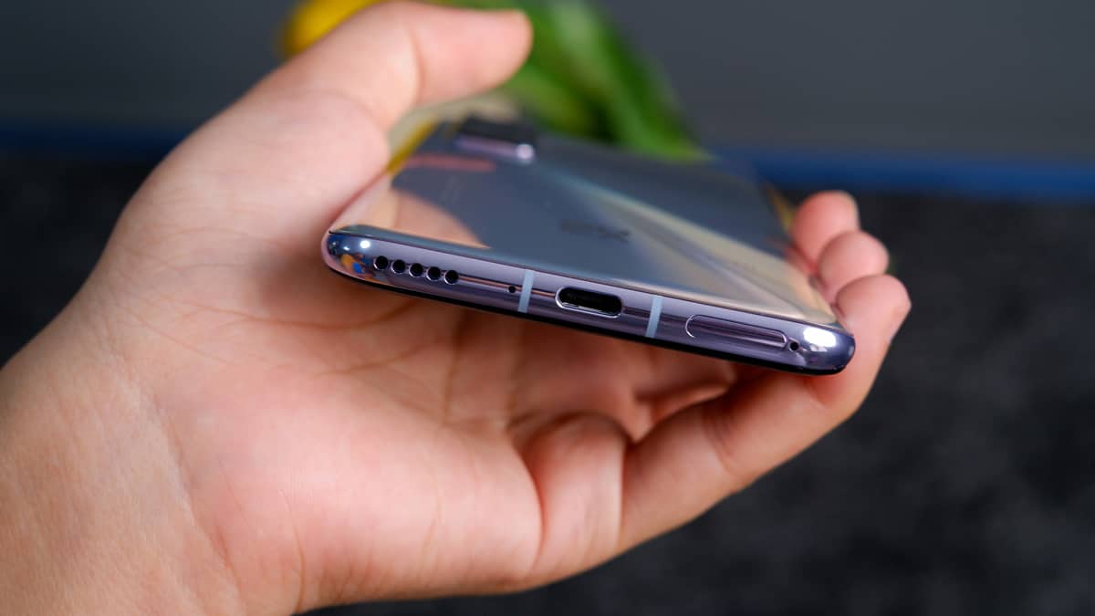 ด้านล่างที่เห็นเป็นช่องลำโพง, พอร์ตชาร์จแบบ USB-C รองรับ Huawei Super Charge และช่องสำหรับใส่ซิม จะเห็นว่าไม่มีช่องหูฟัง จะต้องใช้อแดปเตอร์ตัวที่แถมมาให้กับกล่อง ถ้าต้องการจะใช้หูฟังแบบสาย
