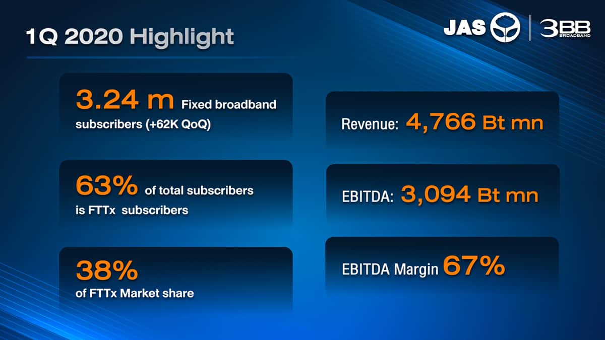 JAS รายงานผลประกอบการ ไตรมาส 1/2563 มีรายได้รวม 4,766 ล้านบาท เพิ่มขึ้นร้อยละ 4 ส่วนกำไรโดยรายได้ส่วนใหญ่มาจา 3BB จากกระแส Work From Home