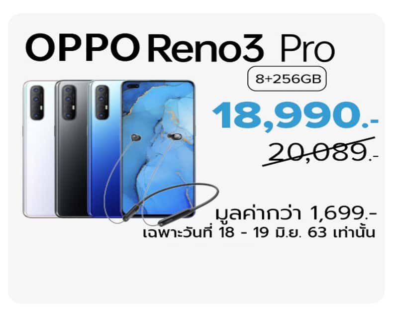 โปรโมชั่น ตั้งแต่วันที่ 18 – 19 มิถุนายน 2563 พิเศษ! เมื่อซื้อ OPPO Reno3 Pro กล้องหน้าคู่ 44MP สวยชัดที่สุดในโลก ราคา 18,990 บาท ผ่าน OPPO Official Store รับฟรีหูฟัง OPPO Enco M31 มูลค่า 1,699 บาท
