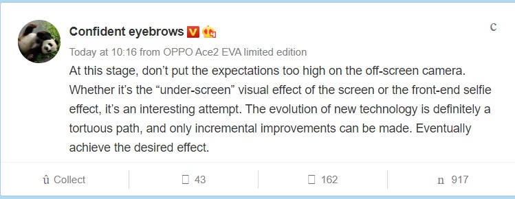 Brian Shen ตำแหน่งรองประธานของ OPPO ได้กล่าวถึงเรื่องนี้ว่า เทคโนโลยีซ่อนกล้องเซลฟี่เอาไว้ใต้หน้าจอนั้นน่าจะยังไม่มีให้เห็นในปี 2020 แน่นอน และไม่อยากให้คาดหวังอะไรกับมาก สาเหตุหลัก คือ เรื่องคุณภาพของรูปที่ถ่ายออกมา เพราะมันจะต่างจากกล้องเซลฟี่ทั่วไปที่ถ่ายผู้ใช้งานตรงๆได้แบบไม่มีอะไรมากั้น แต่กล้องที่ซ่อนอยู่ใต้หน้าจอคงต้องใช้ความพยายามอย่างมาก ที่จะได้รูปออกมาที่คมชัดและความละเอียดสูง มันเป็นเทคโนโลยีที่มีความซับซ้อนและอาจต้องใช้เวลาสักพักใหญ่ๆที่จะทำมันให้ออกมาใช้งานได้อย่างสมบูรณ์