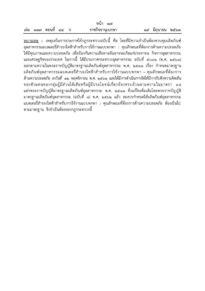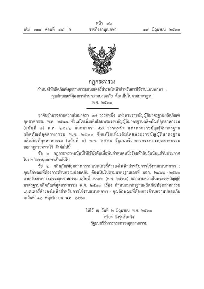 โดยประกาศกฎกระทรวงนี้ กำหนดให้ผลิตภัณฑ์อุตสาหกรรมแบตเตอรี่สำรองไฟฟ้าสำหรับการใช้งานแบบพกพา: คุณลักษณะที่ต้องการด้านความปลอดภัย ต้องเป็นไปตามมาตรฐาน พ.ศ. 2563 ประกาศให้สินค้าที่เป็น Powerbank จะต้องผ่านมาตรฐานบังคับ มอก.2879-2560
