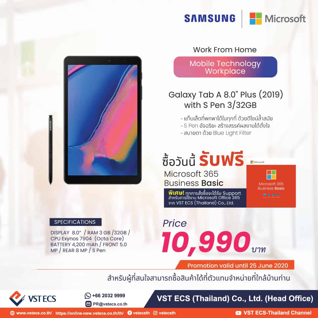 - WFH SmartPackage I – Samsung Galaxy Tab A 8.0” Plus (2019) ความจุ 3.32 GB และ Microsoft Office 365 Business Essential 1 ปี ในราคา 10,990 บาท โดย Galaxy Tab A 8.0” Plus มาในขนาดกะทัดรัดพร้อมกับปากกา S Pen ที่ไม่ต้องชาร์จแบตเตอรี่ ก็สามารถใช้งานได้ทันที และเพิ่มความมั่นใจในการใช้งานด้วย Secure Folder พื้นที่สำหรับจัดเก็บแอปพลิเคชันและข้อมูลส่วนตัวต่าง ๆ ไว้บนฐานข้อมูลที่มีความปลอดภัยขั้นสูง ดูแลโดยซัมซุง ไม่ต้องกังวลเรื่องการโดนแฮก