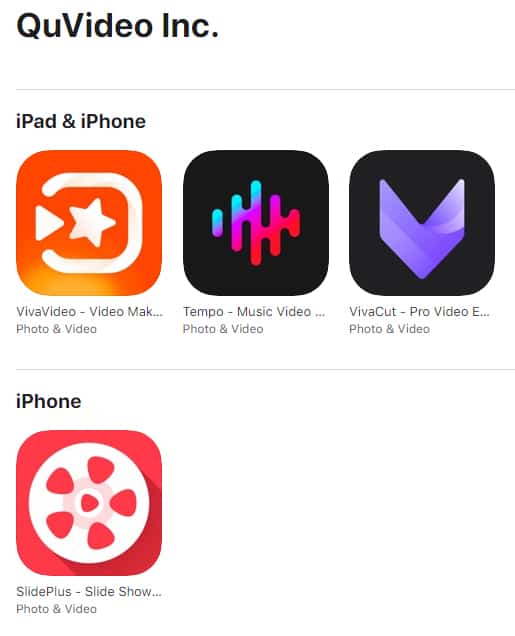 QuVideo Inc. ไม่เพียงแต่พัฒนาแอปบน Google Play Store เท่านั้นแต่ยังมีแอปบน App Store ของ Apple อีก 4 ตัว ได้แก่ VivaVideo, SlidePlus, VivaCut และ Tempo โดย VPNPro ให้ข้อมูลว่าแอป VivaCut และ Tempo นั้นก็มีอยู่บน Google Play Store เช่นกันแต่อยู่ภายใต้ชื่อบริษัทแอปอื่น เพื่อเลี่ยงไม่ให้เชื่อมโยงถึง QuVideo Inc.