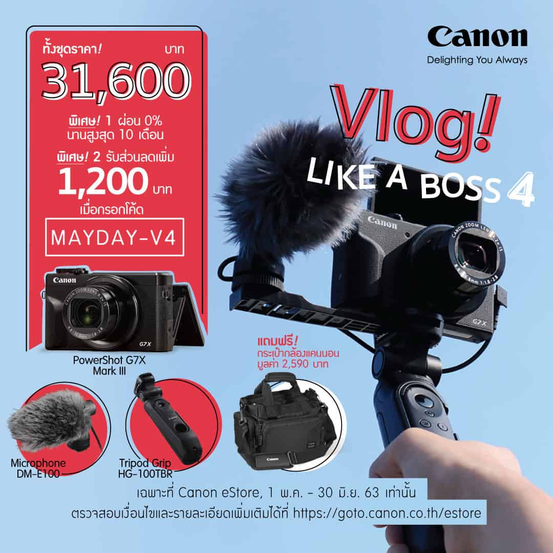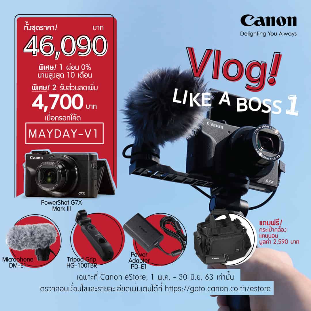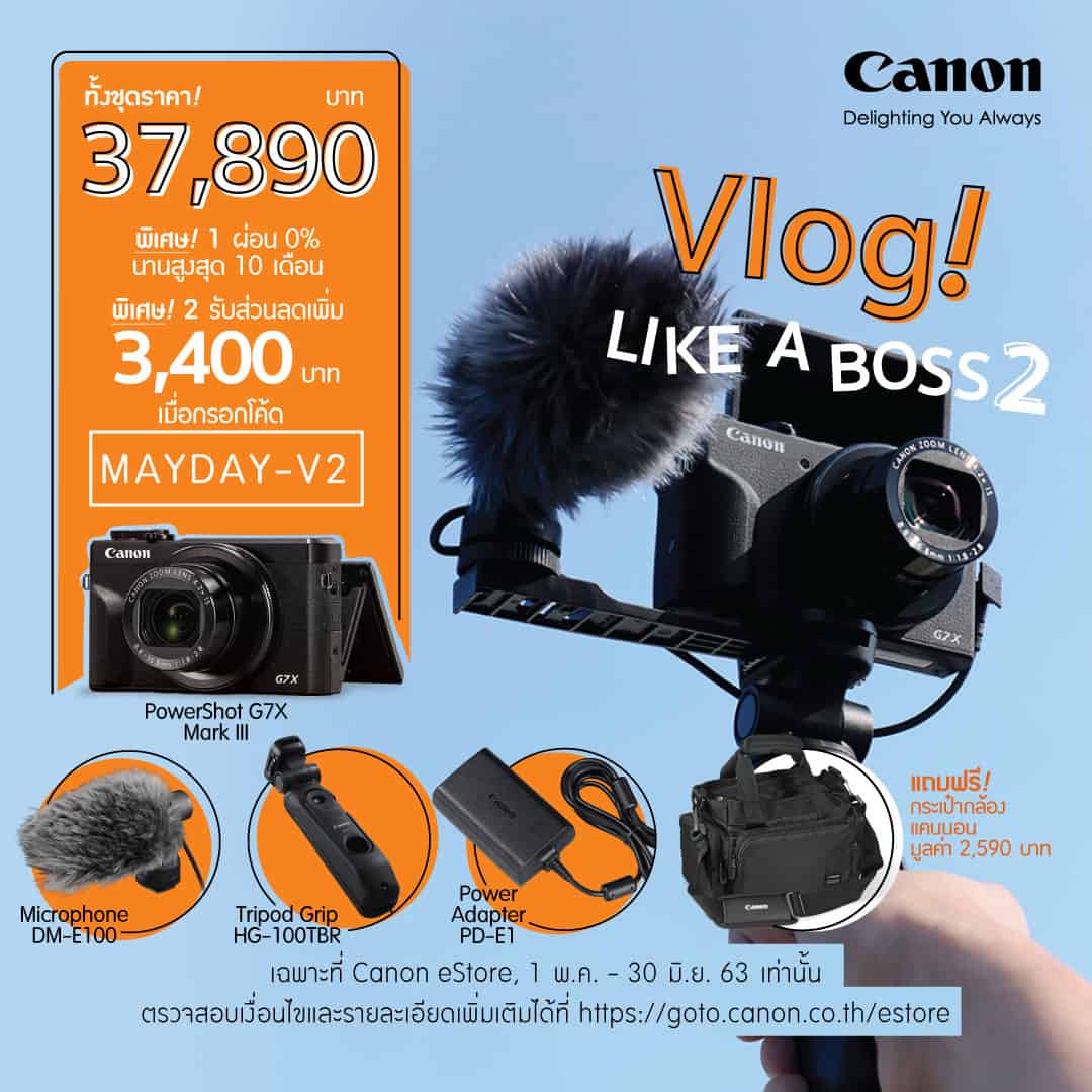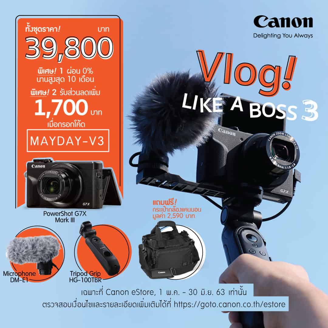 C. Vlog Like a Boss 3 ให้การถ่าย Vlog สะดวกคล่องตัว ด้วยขาตั้งกล้องปรับหมุนได้ตามองศาที่ต้องการ พร้อมบันทึกเสียงคมชัดระดับสเตอริโอด้วยไมโครโฟนภายนอกขนาดกะทัดรัด ภายในชุดประกอบด้วย กล้อง PowerShot G7X Mark III + ไมโครโฟนภายนอก DM-E1 และขาตั้งพร้อมรีโมทคอนโทรล HG-100TBR ทั้งชุดในราคาพิเศษเพียง 38,100 บาท เมื่อกรอกโค้ด MAYDAY-V3 (จากราคาปกติ 39,800 บาท)สั่งซื้อได้ผ่าน Canon E-Store >> https://goto.canon.co.th/estore/promotion/powershot-g7x-mark-iii-for-youtubers-vloggers-set-3.html