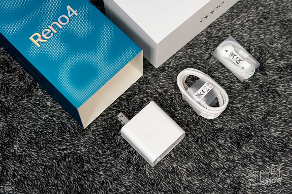 ในกล่องนั้นมีหูฟังสมอลทอล์กแบบแจ็คเสียบ 3.5 มิลลิเมตร, สาย USB หัวพอร์ต USB-A to USB-C และอแดปเตอร์ชาร์จรองรับเทคโนโลยีชาร์จเร็ว 30W VOOC 4.0
