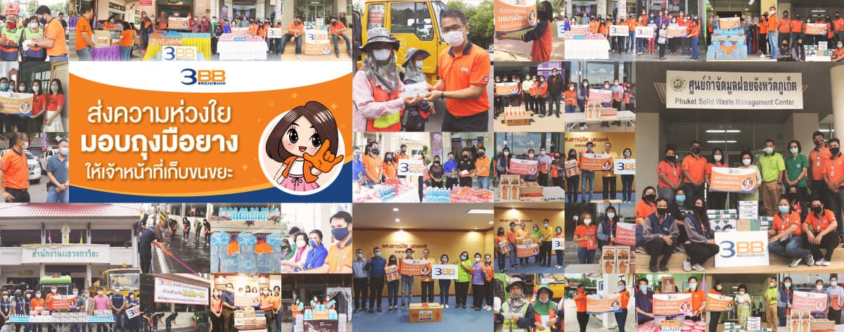 ซึ่งมีจำนวนมากในแต่ละวัน 3BB จึงได้ร่วมกับสำนักงานเขตและองค์กรปกครองส่วนท้องถิ่น (อปท.) เพื่อมอบอุปกรณ์ป้องกันการติดเชื้อ ได้แก่ ถุงมือยาง หน้ากากอนามัย แอลกอฮอล์ ให้กับพนักงานเก็บขนขยะในเขตกรุงเทพมหานครและจังหวัดต่างๆทั่วประเทศ จำนวน 82 แห่ง เพื่อนำไปสวมใส่ขณะปฏิบัติหน้าที่ เป็นการป้องกันอันตรายจากเชื้อโรคและลดความเสี่ยงการสัมผัสเชื้อไวรัสโควิด-19 และทำงานได้อย่างปลอดภัยมากขึ้น